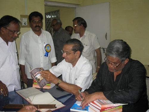 | Hon’ble , Supreme Court Justice Sri Jasti Chalameswar observing the copper plate , explaining by Sri C.Siva Reddy, Research Asst, C.P.B.R.C.L., Hon’ble Vice Chacellor Y.V.U. Prof. Bethanabhatla Shyama Sundar, , Hon’ble High Court Justice K.G. Shankar, Sri K.V. Ramana, I.A.S. Dist. Collector, Kadapa, during Dr. Janamaddi Hanumath Sastri’s statue inaugural function on 19.10.2014. |